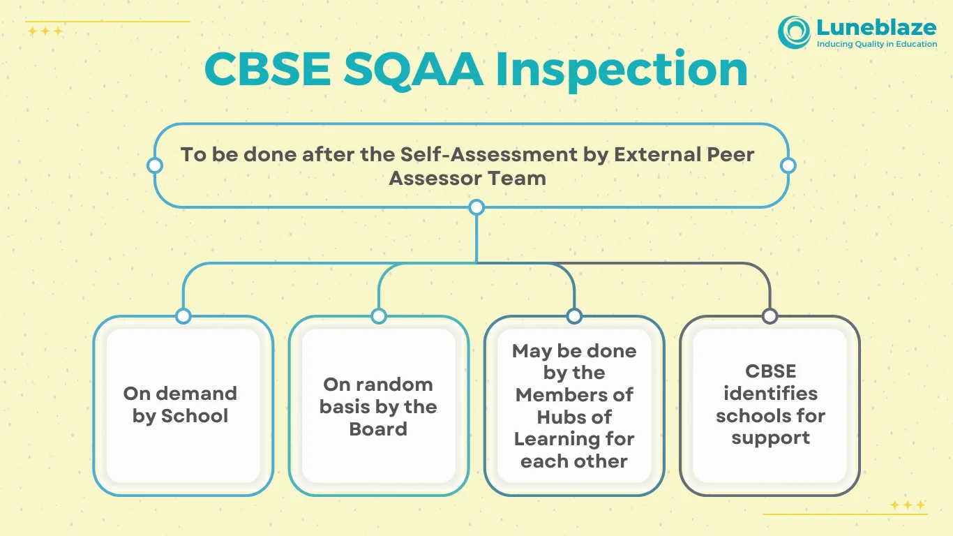 School Quality Assessment and Assurance Form (SQAAF): Schools initiate the process by submitting the SQAAF, a self-assessment document uploaded on the CBSE Portal. This triggers a cycle of review, reflection, response, and rating, prompting schools to evaluate their own strengths and weaknesses.